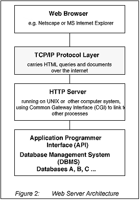 The Web Server which is a standard Web tool and provides the means of transferring user queries across the Internet in a well defined and agreed manor. The transactions at this level are using HTML with enhancement via the possible use of JAVA and Javascript programming. Web servers and browsers are available for all major computer platforms and are essentially compatible with each other.