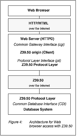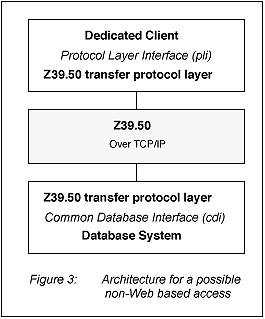 In this new architecture it can be seen that there is a rather complex structure which replaces the previous use of the term Z39.50 Origin (client). This can be understood as everything that is required in order to process a user request and to translate this into a Z39.50 (or other protocol) Query to one or more database systems.