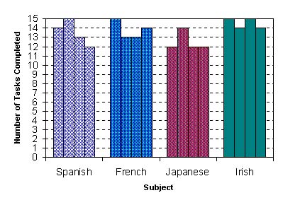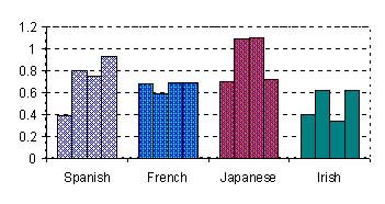 Figure 2: Number of tasks successfully completed While none of the Japanese subjects completed all tasks, two Irish, one French and one Spanish subject completed all 15 tasks successfully. Figure 3: Number of errors per subject per task As the chart in Figure 3 indicates, Japanese subjects experienced most difficulty with tasks; two had an average of more than one error per task. Of the other groups, Irish participants experienced fewest "errors". Errors correspond to the number of superfluous or erroneous steps that users took to complete a task.