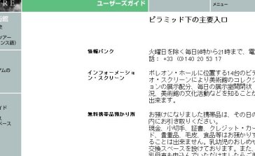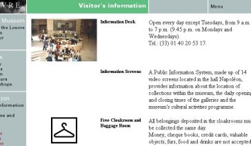 Table 2: Participant Satisfaction with the Site The reasons subjects cited for wishing to use the site again were either to find out more information about the art collections or to view artifacts from the collections. Two subjects who said they would not use the site again remarked that they would prefer a physical visit to the museum than a "virtual" experience. Some overlapping inevitably occurs when comparing usability between groups. There were some problems that affected all, or a large number of, participants. Likewise, participants across groups admired many features of the site. The problems that were most crucial for most subjects, and the features that most subjects admired, are listed below. Top Five Usability Problems 1. Navigation tools are very inflexible. Users must depend almost exclusively on the main menu to carry out any task. The navigation bar at the top of each page was meaningless for Spanish, Irish and Japanese users. 2. Menu labels are ambiguous on all language versions, but especially on French and Spanish. 3. Many parts of the site are only available in French. While the English version is almost complete, Spanish and especially Japanese users are forced to work with very limited functions. 4. The organization of the main menu does not correspond to usersí expectations in many respects. For example, many users expected Temporary and Permanent Collections to be grouped together. 5. There are no links to diagrams of the museum on any language version. Subjects came upon them by chance, or by random searches through pages. There is no usable diagram of the museum on any part of the Japanese version. Top Five Features of the Site 1. Pages are not excessively long, and most users found information with minimal scrolling. 2. Graphics were fast to load. The successful integration of art on this site was noted across all groups. 3. The site has a vast repository of information about artifacts, details of collections, and the history of the museum. 4. The site has a neutral look and feel with no "bleeding edge technology". 5. The site was not offensive politically, culturally, or economically to any of the participants in this study. Discussion The discussion of results focuses on the following international variables: 1. Visuals and Color. 2. Navigation and Access. 3. User Values and Attitudes. 4. Information Expectations. 5. Technology. 6. Linguistic Issues. Visuals and Color Most visuals on the site are culturally neutral as they depict museum artifacts or photographs of parts of the museum. None of the subjects complained about these graphics. On the contrary, most commented on the utility of featuring examples from each collection. In general, there are fewer diagrams on the Japanese version of the site. This proved a severe problem; two of the four Japanese participants commented that they were more interested in browsing through pictures than reading text. Figure 4 shows part of the Reception Area under the Pyramid page from the English language site. Figure 5 shows the corresponding Japanese language page, which omits the graphic.