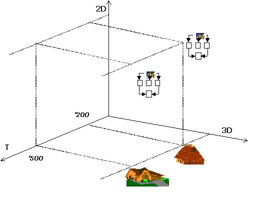 Figure 1: Schema of 2D and 3D temporal navigation To implement 3D and 2D temporal navigation in "Milan along the centuries", we have defined a general software architecture, which can be used to implement temporal navigation for any urban context, once 2D and 3D contents are provided in the appropriate format. The rest of this paper will first discuss more precisely the user interaction paradigms for 3D and 2D temporal navigation, using examples from "Milan along the centuries" web site. Then we will outline the general software architecture underlying the system and mention the line of our future work. 2. User interaction in 3D Temporal Navigation In conventional web navigation, user exploration of a web site usually starts from an entry point (e.g., the "home page") or from a page selected by some search mechanism, and proceeds by selecting the available links connecting to the various pages of the site. In 3D or 2D temporal navigation, user have a number of additional choices, corresponding to the three navigational dimensions: along the 2D space, along the 3D space, and along the time. In principle, one may start by selecting a starting point in each of these three dimensions. Still, in "Milano along the centuries" the first choice offered to the user is temporal, i.e., he or she must first select the time period of interest, and then choose the town zone. Since Milan has radically evolved and expanded along the centuries, the notion of "town zone" depends on the time period, have different granularity depending on the time, and therefore the sets of space representations of Milan in different time periods are not totally "isomorphic" (i.e., not all the possible combinations "town area-time period" make sense). In the thirteen century, for example, only the central area existed (around the Duomo square), and the town zones available in that period are sub-zones of the central area. On the contrary, contemporary Milan includes many other areas among which users can make their first selection. Once users have made their temporal choice, they are presented with a 2-dimensional city map (we have tried to use historical maps of Milan for each time period, as shown in figure 2). From here, users can either identify a starting point for navigation, or select a sub-area when available.