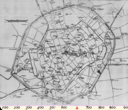 Figure 2: historical map of Milan in the 13° century By default, the virtual exploration of a selected place starts in the 3D world, but the switch to the 2D world may be invoked at any time. In this section, we discuss 3D navigation, while 2D navigation is introduced in the following section. There are two paradigms ("modes") of virtual navigation in the 3D environment, named "walk" and "fly". The "walk" mode mimics the conventional way humans explore a real town – by walking along the streets. During a "walk", the town is progressively disclosed to the user eyes along a bottom-up perspective. As exploration proceeds, monuments and buildings are progressively shown, and an increasing level of detail as the user moves closer (with the cursor) towards the corresponding objects in the virtual environment. Users can penetrate (some) buildings and explore them inside, or proceed along the street. The "fly" mode mimics the way we perceive a town from an aircraft and provides an aerial, top-down perspective of the town: users are allowed to fly over the town and to view streets and buildings from the sky. The system supports a smooth transition from "fly" to "walk" mode (and viceversa): by moving the cursor, users can fly horizontally and vertically, progressively focusing their view of a place up to street level, or progressively taking-off and enlarging their view. Two space representations are active during navigation (in both modes): the virtual 3D environment currently explored by the user, and the space context, i.e., the 2D map from which navigation has started. Both representations dynamically evolve as navigation proceeds. The 2D map highlights the changing position of the user in the area, and the 3D world changes as discussed above. Users can maintain both contexts simultaneously visible on the screen ("dual context view"), as shown in figure 3, or zoom the 3D view up to the full screen size ("zoom view"), as shown in figure 4 and figure 5 (both figures refer to "walk" mode).