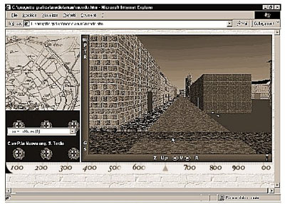 The user interface is the channel through which users interact with the 2D and the 3D worlds. Its purpose is to display 2D objects (web pages) and 3D representations of the current spatial context, to intercept user requests (link selection, movements in the 3D space, change of temporal context), and to pass them to the appropriate engine. The 2D interface that visualizes 2D pages and accepts user-generated events is based on a standard Web Browser. To visualize the 3D VRML objects and to intercept user movements in the 3D space, the user interface uses Cosmo Player or World Viewer (both work well). Based on the user requests sent by the user interface, the generation engines retrieve the appropriate contents from the data bases, and aggregate them to generate the 2D or 3D representation that are then displayed by the 2D and 3D viewers. The communication layer among the user interface and the engines, and between the two engines, has been implemented with CORBA, and, in particular, the events generated and sent by the 2D world to the 3D world are managed by the EAI (External Authoring interface) (Lewandowski, 1998). The 2D Web pages are dynamically generated by the ASP engine (Active Server Pages Site, 1999), which imports information elements from the 2D database (selected according to the current user position in the 2D space, the current temporal context, and the current link selection), and aggregates them according to the structural relationships stored in the 2D data base. The 2D data base stores all the information needed to build the web pages: 2D content elements - maps, texts, images, sounds and videos, and the structural relationships among different source elements that define which elements must be aggregated together in the different pages. The database also provides developers with a user friendly interface to allow them to insert, modify, or cancel information elements and as well as the structural relationships them. The 3D engine creates the 3D VRML representations of the city as user exploration proceeds. It calculates the user position, identify the 3D objects - streets, palaces, churches, fountains, etc. – that must be visualized in the current context, and defines how they must be placed in the 3D world, generating the portion of the city which is relevant for the current user perspective, either in "walk" or "fly" mode, in the current temporal context. To identify how the reconstructions of urban elements must be placed in the 3D space, the VRML engine exploits a set of spatial relations among 3D objects, which define the dependencies between the different space contexts and different objects within each context. The 3D database stores the basic 3D VRML objects and their space relationships, and also provides developers with a user friendly interface to allow them to insert, modify, or cancel objects as well as their spatial relationships. The objects in the 3D data base are typed according to their urban role: Buildings (e.g., houses, palaces, villas, industrial building,…), Church (churches, abbeys, cathedrals,…) and Miscellaneous, which collects all other urban elements, such as trees, fountains, streets, walls, and similar. The objects are also organized in two categories, depending on their role in the generation process: Special Objects and Support Objects. Special Objects are the urban elements which has a particular historical or architectural relevance, and therefore characterize each particular portion of the city in a given period. Special Objects are active, in the sense that they can users can perform a number of operations on them. Special Objects can be zoomed- in/zoomed-out, or explored inside (when this operation makes sense). They also include anchors to reach the Web pages in the 2D world which describes the details of each object. Support Objects are used to fill the virtual space around Special Objects, i.e., of creating the urban context for them. Support Objects are "generic", anonymous urban elements, such as generic houses, trees, grasses, streets, and similar; they have no special relevance from a cultural perspective but, like the generic building blocks of a Lego, they are needed to complete the virtual reconstruction of a space context. As such, Support Objects are often repeated in the visualization of a space environment. Furthermore, Support Objects are static, i.e., users cannot interact with them, and the designer cannot modify them. 5. Conclusions and Future Work This paper has discussed the concept of multiple space temporal navigation, i.e., virtual exploration in a 3-dimension or 2-dimension information space that explicitly takes into account the notion of history and time, and allows user to modify the temporal context of what they are seeing, as well as the space dimension in which they are navigating. We have also proposed a general software architecture that allows developer to build, in a modular way, 3D and 2D information spaces integrated with temporal navigation. The main application domain we acknowledge for temporal navigation is in the virtual reconstruction of historical towns, since the proposed approach discloses the possibility, for the user, of experimenting the virtual exploration of a urban context along multiple historical perspectives. In particular, we are applying the proposed approach to a web application that concerns Milan along the centuries, where we provide multiple reconstructions of the town in different periods which can be navigated in a conventional 2D world as well as in a virtual, dynamically created 3D space. Still, temporal navigation can be applied to any cultural domain in which the content has a strong historical, or, and, more generically, temporal dimension. Even the objects presented in a virtual museum, for example, can be presented in along multiple temporal and space perspectives: as they appear now in the museum, and in the space and temporal contexts in which they has been 