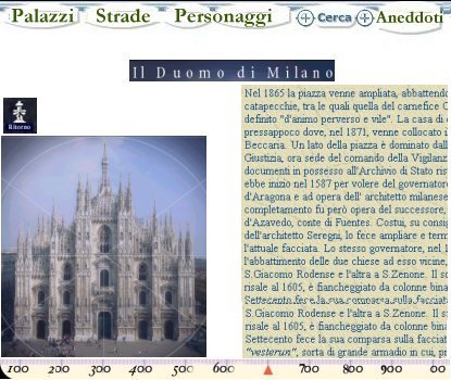 Figure 6: a conventional 2D web page in "Milan along the centuries" In the 2D information space, content is organized along two dimensions: time and space. Each urban object is presented in an historical perspective and has multiple contents associated to it, to describe it as it is now and as it was in different time periods. Similarly to what happens in the 3D space, the temporal context is always active during 2D navigation, to allow users change the temporal perspective of an object description. The navigation in the space dimension is achieved by providing links from an object to the objects that are (or were) physically close to it. At any point, users can switch to the 3D world, and find themselves embedded in a virtual reconstruction of the place in which the object they are visiting is (or were) located. 4. The software architecture The software architecture that implements 3D and 2D temporal navigation in "Milan along the centuries" is depicted in figure 7. It provides a general, flexible implementation framework, which allows developers to reuse the modules developed for our specific case study and to easily adapt them in order to implement temporal navigation in any urban context, once the representations of 2D and 3D objects are provided in an appropriate format.