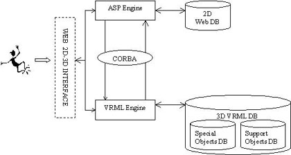 Figure 7: the general software architecture of "Milan along the centuries" The core idea of our technical approach is that both the 2D and 3D environments are generated dynamically as user navigation proceeds. The main modules of the architecture are: