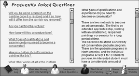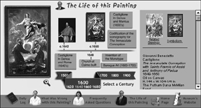 The "Life of this Painting" section Upon entering the "Life of this Painting" section, the user is presented with a timeline from the 16th century to the present . The timeline contains both text and imagery and is interactive. By clicking on centuries or decades, the user can walk through time exploring key events that hold a direct relationship to the painting being restored. The methodology is designed to expand the visitorís context for the restoration by highlighting items such as the life and travels of the artist and painting, technological developments in conservation and related art historical events. The paintingís curators and conservators generated the information contained within this section. Members of the IMG further enhanced this information through additional research. Frequently Asked Questions