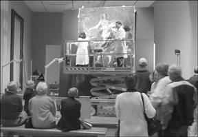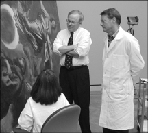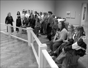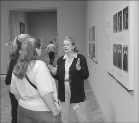 Museum docent referring to the didactic panels in exhibition The Central exhibition space was divided to provide public space as well as a partitioned work area for the conservators and the painting. Didactic text, graphic and photographic panels wrapped the walls of most of the public space. These didactics included an outline of the steps in the restoration process, schematic diagrams of the paintingís physical structure and x-rays of areas of damage and earlier restoration. One wall contained a set of numbered procedural panels designed with spaces reserved for images of the completed steps or phases in the restoration process. An iMac computer was installed on special counter with two chairs in one corner of the public area. This computer provided access to the online portion of the exhibition using a Netscape web browser running in kiosk mode. The computer served to both extend the available project information within the gallery as well as to market the fact that the ongoing project could be viewed and followed from any computer with internet access.