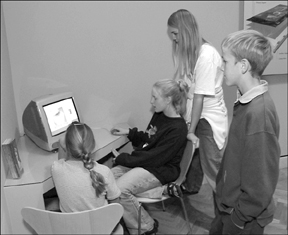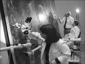 Young visitors using the "Restoration Online" internet kiosk For most of the conservation treatment the painting was placed on a large movable easel in the center of the partitioned conservation space. Special lighting was installed and a power lift was used to assist the conservators in working on the huge painting. A small railing was installed to keep the visitors at a safe distance while allowing them to be close enough to view the detailed work of the conservators and ask them questions. Gallery benches were placed on the public side of the railing to allow visitors to sit comfortably while observing the progress of the restoration. Museum docents and volunteers were stationed in the gallery during heavy traffic periods to assist the conservators in answering the many questions posed by the visitors.