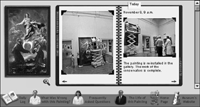 A school group and docent visiting the exhibit School children were particularly interested in the idea that the exhibit could be visited through the internet. Even though very few tour guides and teachers permitted students to use the kiosk in the gallery, many children responded enthusiastically when told about the web site. Most children left with a promotional bookmark in hand, some expressed excitement over the opportunity to visit the online exhibit at home with their parents. The Conservator's experience While the museum staff and many of the visitors had a significant amount of experience with both web and interactive multimedia educational programs, the UMCA painting conservators had very little of these experiences personally or professionally. They were accustomed to working in a quiet, private laboratory setting with little or no interaction with visiting public. The prospect of executing a large-scale restoration of a major painting in public was provided enough unusual challenges, never mind having a computer kiosk in the gallery with them. And while they were very cooperative in providing extensive amounts of information for the online portion of exhibit, both were concerned that the media would not be flexible enough to document all the unpredictable twists and turns in the treatment process.