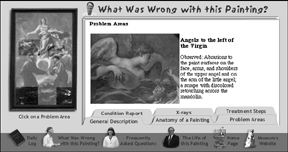 The "Whatís Wrong with this Painting" section "What's Wrong with this Painting" presented viewers with detailed information on the painting's technical problems. The section was designed to look like a series of manila folders containing text, photos and illustrations. Documents such as condition reports and proposed treatment procedures which are normally not accessible to anyone other than conservators and curators were available (in an edited form) within these folders. Other folders contained x-rays of the painting, photos and descriptions of damaged areas, interactive schematic diagrams examining the physical construction of a painting and a glossary. Most of the information in this section was gleaned from interviews with the conservators and through interactive enhancements to the didactic gallery information. Life of this Painting