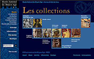 Room for ThoughtIt should be pointed out that a large part of the collections of the Musée Guimet consists of piecese.g. statues, steles, paintings, etc.which were/are religious objects, or of objects that had been displayed in a religion setting, such as temples. These pieces were venerated, worshipped, used in ceremonies, and so on. This particularity of the museum's collections and the respect paid to their display was, of course, taken into consideration in the various incarnations of the museum. Over time, however, maintaining such a space for contemplation became more difficult as the interior spaces of the museum became more and more cramped and closed-off. In their plans for the new interior of the museum, the architects Henri and Bruno Gaudin ensured that there was sufficient space for the works on display. The spacious galleries of the museum give the visitor room to contemplate the objects, to concentrate on them and to think. In addition, the arrangement of the various spaces and volumes and the materials used in the displays do not interfere with the collections, nor do they draw attention to themselves. It is not possible to reproduce the subtleties and implied meanings of such three-dimensional spaces on a Web page, but the idea that the Web site should be in some way a space for contemplation informed the design process. As a result, pages and templates are not crowded: the palette of colors is attractive but muted. Site navigation headings are placed on the left side of the page in small type. The pages describing the highlights of the collections are fairly unadorned, drawing the user's attention as much as possible to the image and the text describing it. In attempting to create this contemplative aesthetic, the Guimet site follows the lead of other Asian art museum sites. It was interesting to note that this approach is particularly evident in museums in Asia, much more than anywhere else. Examples of institutions employing a relatively spare interface include the Ho-Am Museum in Seoul (www.hoammuseum.org), the National Museum of Korea (www.museum.go.kr/), the Museum of Oriental Ceramics in Osaka (www.moco.or.jp), and the Kyoto National Museum (www.kyohaku.go.jp). Geography, Politics and the CollectionsDisplaying images from the collections is, obviously, one of the primary goals of many museum Web sites, and this was important for the Musée Guimet as well. The first museum to benefit from the RMN's Web site project was the Cluny Museum, or as it is now known, the Museum of the Middle Ages. As can be seen in Figure 4 , the Cluny's collections are grouped by material and theme, and this method of classification was also offered to the Guimet at the beginning of the architecture design process.