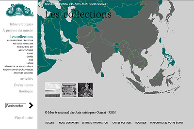 Although this approach is a valid one, and is taken at other Asian art Web sites, it was ultimately set aside in favor of a geographical approach to the collections. As shown in Figure 5 , after clicking on the link "The collections", the visitor is presented with a map of Asia. He or she then clicks on a country or region to view works of art from the chosen area. There were several reasons for this: first, the Guimet's galleries are arranged geographically, and arranging the site in the same way would offer an accurate reflection of the museum. In addition, having to enter via a map offers subliminal information to the visitor: the size and diversity of the Asian continent, the size of the various countries relative to each other, etc. Finally, and most importantly, it was felt that such an approach individualizes the various Asian countries instead of reducing them to the sum of their artistic achievements, and that this approach would have more appeal to Asian visitors to the site.