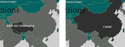 This approach was not without problems, howeverin particular, the very sensitive problem of Tibet. One of the curatorial departments at the museum is called "Nepal-Tibet". The same term is used in the galleries themselves. This is a well-known and useful classification in the world of Asian art museums. However, it presents a problem when it is to be used on the Web. Even though the term is strictly an art-historical one, its use invokes this very sensitive political issue. China, as is well known, considers Tibet to be a province of ChinaXizang Provinceand not an independent country. Using the term "Nepal-Tibet" could quite possibly alienate a portion of those visitors the site is hoping to attract. There is another term which is in use in certain museums, "Art of the Himalayas", and it was decided that it would be more appropriate to use this alternative term. However, this did not entirely solve the problem. Access to the collections, as we have seen, is via an interactive map. As the user moves the cursor over a given country or region, the shape of the region becomes black and its name appears. In the case of Nepal-Tibet, even with the change of designation, the rollover would havequite literallyhighlighted the separateness of the region from China. The decision was finally taken to include the shape of Tibet in the rollovers twice, once in the Nepal-Tibet region and again in the outline of China. The shape of China thus displayed will be familiar to Chinese visitors, and in which no Tibetan border is shown, while the area of Tibet is clearly outlined and delineated in the context of the Art of the Himalayas (see Figure 6 ).