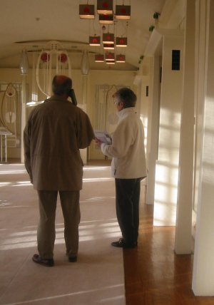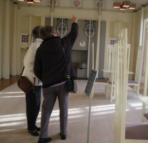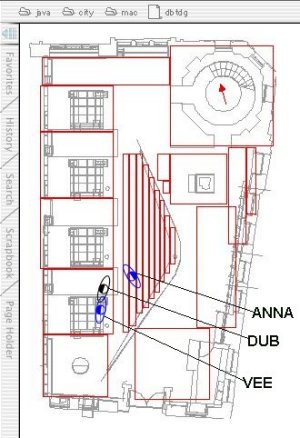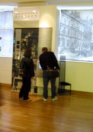 Visitors using audioguides usually experience this style of interaction. The audioguide often works as a resource for discussion despite the fact the device itself is not designed to support explicit interaction between visitors. This style of co-visiting also seems to favour gestural communication: a person may want to share an experience but not to interrupt the companions experience, so favours hand gestures or eyebrow movements rather than verbal communication. Independent navigation occurs in covisitors who visit displays separately from each other. Each person has an individual pace, resulting sometimes in people waiting for the covisitors outside the galleries, or slow visitors cutting their visits short in order to catch up with others. Repeat visitors to the gallery often follow this style, and in some cases they leave the immediate space of the gallery and proceed to another room. Repeat visitors also tend to not take the audioguide at all or to consult it very infrequently compared to less experienced covisitors. This style of co-visiting includes many meeting points between the members of the group: sometimes accidental, sometimes deliberate. For example, two covisitors may meet accidentally when their independent paths cross in a display that is of interest to both. In order to deliberately meet, one visitor may change navigation in the space, moving very quickly between points with good visibility in the gallery in order to find the covisitor. Regardless of the way people meet, they discuss what they have seen in their individual tours, or suggest displays to each otherin some cases almost dragging their companions to show them a specific display. They also discuss the logistics of the visit; for example, where to go next, when they will have lunch, and so forth. It is important to point out visitors do not rigidly conform to the same archetypal style of interaction during a visit. In all observed cases, covisitors experienced their immediate social context through direct and close interaction at some times, and peripheral awareness at other times. Each co-visitor takes advantage of a dynamically changing set of resources. We identified mutual audibility, mutual visibility and shared content as essential resources in co-visiting. These three do not influence each of the interaction styles described above to the same extent. Closely connected covisitors use all three of the resources extensively. They have concrete knowledge of their companions locations and orientations, which are often similar to their own. They talk almost constantly with each other, and share content whether in the form of touch screens, video screens or labels. They can share and explore interpretations of content seen or heard previously. Loosely connected covisitors are also aware of each others location and possibly orientation at any given moment. They use verbal or gestural communication, but they do not necessarily share content synchronously. Finally, independent navigators are only peripherally aware of their companions locations. Such a visitor will usually inform covisitors in a room when about to leave it, and indicate a destination, if their mutual awareness extends beyond a single room. They do not constantly share other resources but are potential users of all of them during meetings. The Current SystemIn parallel with our studies, we have developed a system to explore social context that bridges or blurs the boundaries between visitors who are local and remote, and between digital and physical. The system involves three types of visitors: someone walking around the Mackintosh Room with a wearable computer, someone remote from the Mack Room but moving through Web pages related to the room, and another remote visitor using a VR model of the Mack Room. A set of scenarios (Chalmers, 2001; Galani, 2001) was used to further explore the concept of co-visiting in museums and the city, and as a focus for system design. In our current scenario a visitor to Glasgow, Vee, visits the Mack Room in The Lighthouse. While browsing the displays, she invites her friend Anna, who is some distance away, to join her on the visit. Anna joins in by accessing an on-line 3D model of the room. A third friend, Dub, is then invited; he joins them by accessing the Web site for the room. The scenario introduces three different visitors who are remote from each other, and who have access to different technologies. Such scenarios have proved an effective way for a diverse team of researchers to communicate with each other, allowing us to shift our focus between studies, design, implementation and evaluation while maintaining a common context.
