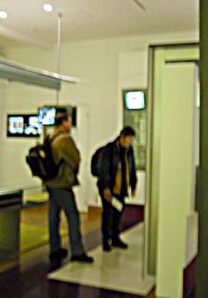 The pace of the visit is an essential factor in this style. People usually share their interests in the displays and also share a pace of reading the available material. They also decide together where to go next. This style of interaction occurs quite often in galleries where information is not easily available or accessed, so people tend to move around together and help each other to interpret the exhibits. In the second style of interaction, covisitors are loosely connected. These visitors do not consistently interact with the same objects and displays, but stay close enough to maintain an awareness of each other. They usually exchange brief comments about what they have seen and point things out to each other. They may be very close to each other but engaged in quite different information, as in the leaflet reader and audioguide listener in Figure 3, and may attend to different displays at any given moment, as in Figure 4.