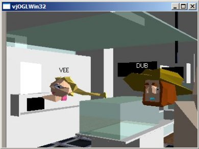 Vee, or the visitor in the role of Vee, has a handheld computer, an HP Jornada, which supports wireless network communications. She also has a jacketBristol Universitys CyberJacket, shown in Figure 5that has within or on it several devices: an ultrasound detector to register position within the room (Randell & Muller, 2001), an electronic compass to show orientation, and a battery. Cables within the jacket connect these parts to each other and to the handheld. The recorded position is updated every few seconds and sent off to another server computer (hidden behind the reception desk of the Mack Room). The handheld computer can be used to browse pages about the Mack Rooms displays and artefacts based on the exhibitions catalogue and delivered from the Web server on the local network. A number of those pages generally describe thematic zones within the room. We support automatic triggering of those pages: if Vee walks into a thematic zone within the room, a Web page for that zone is automatically displayed. Dub has a normal Web browser running on a laptop computer. We currently set this laptop in The Lighthouse but away from the Mack Room, and connect it to the local network. He can browse pages about the Mack Room, and by tracking the zone associated with each page displayed, we imply a position in the room for him. Anna uses a VR model of the Mack Room as well as a Web browser. Unlike the Web visitor, Annas position is her position within the virtual environment. We initially experimented with the room-sized immersive VR display (ReaCTOR) at University College London (UCL), but current experimentation happens within The Lighthouse, where we use another networked laptop showing simpler desktop VR graphics. Each visitor has a microphone and headphones, and can talk with the other two. We initially used mobile telephones to support conversation, but now have audio connections within our system. Each visitor can see personal location as well as locations of the others. Vee and Dub each have a map showing the Mack Room set within their Web page and showing visitors ongoing positions as dots, as in Figure 6. Anna has her covisitors shown as avatars, as in Figure 7.