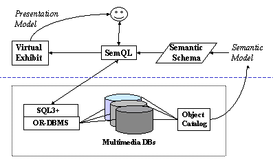 The upper part of Figure 1 shows the main components of a user interface for retrieving information from the database collection and presentation of the results as a virtual exhibit. Resource Location & Metadata developmentThe interface is based on a semantic model of the object catalogs so that similar objects can be identified in the separate source databases. The ICT implementation of the model is termed the semantic schema and contains a union of the local collection metadata as well as term thesauri for the collections. Data access and retrievalThe SemQL query language is an extension of SQL3. Based on information from the semantic schema, SemQL is able to construct local queries to those databases that have data relevant to the user query. SemQL also has a user interface that is similar to those used in the advanced search functions of Web search engines with the addition of an interactive dialog system to assist with early refinement of the user query. PresentationA virtual exhibit construction module presents the results of queries to the system. The presentation module can construct a set of Web pages, a topic exhibit, for presentation of the query response. The resulting exhibit can be further modified by refining and resubmitting the SemQL query. 2.4 The virtual exhibit projectBergen Museum, in Bergen, Norway, has embarked on a project, described briefly by Ramirez (2001), to establish and publish a number of different multimedia databases implemented by theme and media type. The project has funding from a grant from the Norwegian National Research Foundation (NFR), and the available databases can be found at http://museum.uib.no. The collection of databases currently includes 3D databases for sculpture and insects, a video database of centipedes, a film database from social anthropology projects, plus various text-document and image databases. At this time, the databases are not inter-connected and are not connected to virtual exhibits. When the first phase of the database set has been implemented, the system is to be integrated with similar systems in other Nordic museums. At the Department of Information Science, University of Bergen, weve begun a project in cooperation with the Bergen Museum project, described in Nordbotten (2001), to develop tools that can utilize their databases for development of virtual exhibits. The framework for the project is given in Figure 1 above. This project is also supported by NFR and has funding for 6 researchers and graduate students. Project goalsThe primary project goal is to develop methods and tools for creating on-demand virtual exhibits from multiple multimedia systems, as illustrated in Figure 1 above. The new methods and tools are to be an integration and extension of appropriate methods developed separately for metadata, multimedia, and multi-database management. Sub tasks for construction of a system for virtual exhibits on demandThe following methods and techniques will be developed in the coming 2 years: