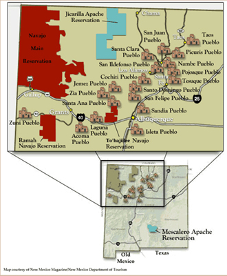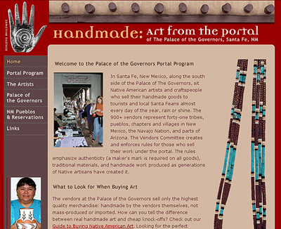 also seen on the Web at http://www.newmexicoindianart.org IntroductionAlong the south side of the Palace of The Governors in Santa Fe sit Native American artists and craftspeople who sell their handmade goods to tourists and local Santa Feans almost every day of the year, rain or shine. The over 1,000 vendors represent forty-one tribes, pueblos, chapters and villages in New Mexico, the Navajo Nation, and some parts of Arizona. Each morning the Vendors Committee conducts a lottery to see who will occupy the eighty or so spaces available under the portal that day. The Vendors Committee also creates and enforces the rules for those who sell their work under the portal. The rules emphasize authenticity (a makers mark is required on all goods), traditional materials (sterling silver is permitted; silver plate and commercial liquid silver is not), and handmade work made as generations of Indian artisans have made it. The Portal Program's coordinator has raised the vendors' interest in the Internet as a viable "location" that could expand their markets as well as accomplish other significant goals. These goals include public information and member training. The vendors want the world to know what defines authentic Indian art. They also want non-Native people to have greater understanding about the diverse cultures and art traditions represented in the Portal Program. Finally, the artist-vendors recognize that they need training in the use of electronic media in order to expand their income potential. It is appropriate, if ironic, that contemporary technology can work so effectively to preserve traditional American art forms and cultures by serving a population that is underserved, rural and unique. History of the Palace of the Governors and Native American Vendors ProgramThe Native American Vendors Program has been an official educational outreach program of the Palace of the Governors since 1922. The Museum of New Mexico was established by the territorial government of New Mexico in 1909. Originally located in the Palace of the Governors, the Museum has grown to include sister museums in Santa Fe - the Palace of the Governors History Museum, the Museum of Fine Arts, the Museum of International Folk Art, and the Museum of Indian Arts and Culture - as well as five state monuments throughout New Mexico. The museums share centralized support services, including exhibitions, conservation, travelling exhibits and state-wide programs and education. The Palace of the Governors has been a center of activity since its construction as New Mexicos second capitol in 1610. Said to be the oldest continuously occupied public building in the United States, the Palace has housed such diverse occupants as Spanish governors, a Pueblo Indian community, and the territorial governments of the Mexican and American republics. At the time of the Pueblo Revolt in 1680, the Palace of the Governors was abandoned by the Spanish, like the rest of New Mexico, to the indigenous Pueblo Indian people, who held the building for the next thirteen years, converting it into traditional apartment house dwellings. When don Diego de Vargas led his Army of Reconquest back to Santa Fe in 1692, he found that the Palace resembled the multi-storied Taos Pueblo. Since its founding in 1909, the Museum of New Mexico has worked to protect and promote traditional Southwest Native American arts and crafts. Museum policy has traditionally reserved, and, in 1979, won the legal right to reserve, the portal of the Palace of the Governors for the exclusive use of Native Americans to display and sell wares they or members of their households have made. As was mentioned above, the Native American Vendors Program became an official organ of educational outreach for the Museum of New Mexico in 1922.