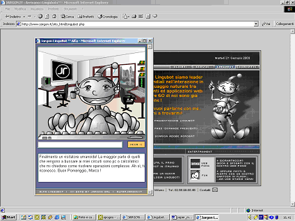 2001). Chatbots are not a new idea. Eliza, the famous software icon who simulated a psychiatric interview in the Sixties, was somewhat an ante-litteram chatbot. Chatbot started to flourish in Internet Relay Chat (IRC), an enormous chat environment born in 1988 and still commonly used. IRC offered powerful programming options to its more experienced users, so many programmers started creating software to simulate human chatters (Herz 1995) .Today there are many different kinds of chatbots able to chat in different languages. (Check for examples at www.agentland.com ). Most of them are based on the same principle: the text input of the human counterpart is compared to a knowledge base of sentences and keywords, in order to identify a suitable answer using matching rules set by the programmer. Chatbots are used mainly for entertainment, even if some alternative applications are arising in the commercial field (for example, as virtual shop assistants) and in the cultural one (an interesting example as a virtual tour guide is being presented in MW 2003 too; see Almeida-Yokoi 2003). In our project, we teamed with two specialists in chatbot technology (Morgana Caldarini, co-author of the present paper, and Andrea Manzoni, both founders of Jargon, a Milanese Web agency). They launched in April 2002 an innovative Italian chatbot answering to the name of Alfa (currently online at www.jargon.it ).