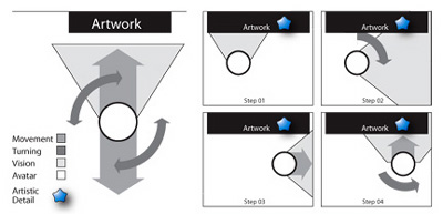 new media. The Impact Of Mouse And ScreenExamining FailureThe reasons for failure are diverse. The literal copying of the physical space into virtual space has been less than successful. As we address these failures, we reinforce the previous assertions of gallery and the GUI. We can begin with a common misconception, that virtual reality works just like physical reality. This idea completely fails to account for the hardware through which we interact. Screen-based, mouse-driven, virtual environments (SMVEs) utilize a vastly different interactive methodology. Two issues that quickly become apparent are navigation and interaction. Unseen FeetNavigation issues arise on the ends of the spectrum; wayfinding in larger environments and short, goal-oriented, precision movements. To understand precision, one can look to video game design. Games that require precise positioning in their environment use a third-person viewpoint. Less immersive than the first-person viewpoint, the third-person perspective allows a uniquely powerful navigational advantage you can see your feet. As simple as that sounds, it makes all the difference. Like a cursor in a GUI, feet show the absolute position of the user in the environment. More precision issues lie in the standard movements allowed by most Web3d applications: move forward/backward, turn left/right. Compared to the flexibilities of human mobility, the two-button mouse is quite handicapped. The issue is evident when the user zooms in to see a work close-up, and then wants to see another section or detail of that work close-up. The diagram below shows the unwieldy process by which most users try to see the detail. Note Step 03: users need to position themselves in front of the detail without seeing it.
