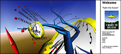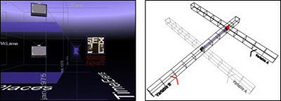 Figure 2: Library in "Town Square at Ariadne" - J. Sonstein Each book links to a topic in the Yahoo database; the computer is a link to a Bosnian info site. Metaphorically, the layering of informational structures (i.e. books and computers) inside a virtual space is thought provoking. In terms of functionality, it is less than optimal. Books and computers were created for use by human hands. The mouse was developed for two-dimensional interfaces. Leaving the RealThe reasons for merging GUI and gallery are becoming apparent as mirrored reality approaches falter. As technology advances and allows for more natural manipulation and navigation, we realize that the greatest empowerment may still lie beyond the current notion of reality. Take, for example, the fundamental mechanism of interactive design - the button. Does the button exist in nature? Do birds and bees press buttons? This abstract means of control constructed with finger operation in mind and placed within arm's reach has become to us second-nature. Recognized by repetitive cause and effect, the button becomes intuitive. Even when the mechanism below the button is beyond the user's comprehension, such as physics and the codes that make my computer keyboard operate, the action feels natural. As we move toward a native virtual design, vast possibilities emerge, possibilities that stem from a legacy of mouse and screen. The next section moves into abstract territory, presents issues inherent when reality is left behind, and then offers harbingers of future design. Harbingers of Native DesignA Realm of Pure InformationAuthors like William Gibson and architects such as Michael Benedikt left reality behind. Space as interface, as database, a "realm of pure information", this was the desire of early virtual reality theorists. Abstract visionary environments were designed for the human mind, not the body. Information in graphs and charts surround the user. The philosophic papers of this genre are deeply moving - these environments, these dynamic hyperspaces are beautiful works of art. Yet, overloaded with imagery and force fitted with data, their functionality is forgotten. Despite the ability of three-dimensional space to hold vast amounts of data, it is important to remember that; "Less is more". Data representation in three-dimensions is difficult because spatial-visual information generated by the space does not support and often contradicts the data the developer wants represented. Perspective and shading throw a wench into our ability to compare and quantify. Furthermore, the informational narrative created by moving through or rotating the space offers little practical benefit for data that is not inherently spatial or placed with that in mind. To delete the spatial information is to return to two-dimensional space. This then becomes a dilemma of purposes: navigatible space requires visual-spatial information that cues the users, allowing them to move through it, but data representation seeks clarity and comparability. We can summarize the failings of prior works in two general categories: realistic environments that did not compensate for the affordances of mouse and screen, and data driven environments which could not structure the information to the required level of clarity. The former is a function of technology, the latter of purpose. To find solutions is a two-fold process. In the next section, Towards a New Interaction and Architecture, we'll briefly address native navigation and interaction techniques. For the second part, the question of purpose, we move from realistic or data driven ideals and return to William Rubin's issue that "museums are ... emptied of all connotations other than art." We explore connotations and connections in the section entitled Examples of Exploration. Towards a New Interaction and ArchitectureTo address the root issues of user interactions, we must design objects to be user friendly. Size is often the simplest fix: larger objects are easier to see, easier to click on and proportionately easier to correctly navigate to. Smart objects are possible, and they occupy a range of possibilities. Most Web3D languages allow for "Billboard" objects. These flat panels or even full 3D objects automatically turn to face the viewer. If the panel contains visual or interactive elements, this is an easy way to allow the user to read or touch it head on. Beyond turning on the y-axis, the objects or panels can gently slide into the path of the user. A more aggressive approach is having the interactive object grab the user and position him or her as needed. The effect of this is somewhat jarring to the user and, if used, ought be supported by the narrative of the space (i.e. the designer can provide an alternate reason for moving the user). A designer can also break from the interior of the space and place information into a heads-up display or even into a side HTML frame. This pop-up can be based on user positioning or be activated by a button on the user's "dashboard". While a level of immersiveness is lost, the ease by which the user can interact is greatly enhanced.