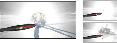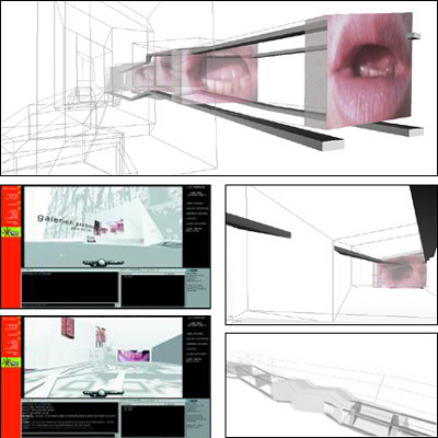 Figure 03: S. Guynup. Surreal Menu When designers remove items like chairs, tables, lamps from a screen-based, mouse-driven virtual environment (SMVE), a sense of emptiness appears. The effect is emotional as the user has few pre-existing cues to guide the relationship with the space. Real world items also form a basis for comprehending the size and layout of the space. In appropriate amounts, these elements cue the user's navigational behavior (in larger - or even just realistic amounts they can be cumbersome). To compensate, some virtual architects take a deconstructive approach. They add visual interest and navigational cues by breaking the flat planes of wall and floor. Slight angles and wire frames can reinforce the user's sense of three-dimensional space. Some authors add background animation to give "life" to a space. Patrick Keller's Alternate Fabrique shows the classic architectural interpretation of virtual structures. To generate a sense of space that appears full yet lacks benches and lights of the realistic spaces, Keller breaks and bends his galleries, extends faux structural elements outwards. Lines stretch like taut ropes and help define forms that are weighted yet weightless. Figure 04: P. Keller. The Alternate Fabric gallery "Expo 1:prothese digital" http://www.fabric.ch/La_Fabrique00/prothese.html Often, designers use bold colors and oversized visual elements to fully fill their virtual space. This effect, usually fun and visually engaging, plays off the user's previous knowledge of two-dimensional animated cartoons. There is a second benefit to scaling elements in the environment upwards. Large elements are typically easier to see and interact with. Large elements give the user a larger area for proper positioning and can be a solution to problems of precision navigation