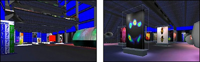 Figure 5: an information space from VGTV's Global Learning Prototype , K. Dudesek, founder. http://www.vgtv.com/p,500029,1.html Both of these approaches represent a lateral expansion of reality. To understand this, compare the real world environment of New York City to that of the Arctic tundra. Visually, they are extremely different, yet the same laws of nature and physics apply. Gravity is always active, and the ground is solid. In virtual environments, these rules are flexible; they are at the whim of the world builder. At a deeply fundamental level, there are abstract concepts governing reality that are subject to review. In real environments, objects are persistent and shared. In the virtual, these rules are by default, reversed. Objects are typically unshared and non-persistent. While this is seen as commonplace within a GUI, the long-term impact on the design of virtual space is unknown. As we exploit the native characteristics of SMVEs, a path becomes clear. We merge the speed and clarity of two-dimensional interfaces with the immersive, experiential aspects of three. In structuring space as subsets of explorable data, we can group and display information in new ways. We can add a level of connection and to some extent the connotations that were previously unreachable. Examples of ExplorationThe following museum built by Christiano Bianci typifies the subtle border of lateral expression. It has a strong and controlled color scheme and presents its exhibitions within wire frame boxes. At the same time, real world new media trade shows and art exhibits have a very similar sense of place.