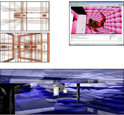 Figure 6: C. Bianchi. Interior of "The Science Museum" Stairs could have been used to connect the three floors of this virtual gallery, but in these environments, stairs are difficult to use. So instead, we teleport, using what appears to be a kiosk (left image). Note that while it resembles a kiosk, it utilizes a GUI menu structure that in fact even says "menu". The Navigatible DatabaseThis discussion begins, surprisingly enough, with a space that responds to the user's movement. Although not typically seen as mobile, databases possess a formal order that is navigated and manipulated. We can transcribe the database into a three dimensional form. The example below by Christiano Bianci does just that. As the users move through the space, the data appears to them. The left image is a screen capturel; the right is an illustration of action.