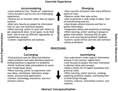 Figure 1. Kolb's model of learning styles. Adapted from Kolb et al. 1999. Kolb's model of learning styles reveals another challenge: how to engage these various ways of learning via a flat computer screen. The Web as an "information superhighway" is ideal for Assimilating Learners who prefer reading and reflective analysis. But what about Accommodating Learners who prefer social environments, or Divergent Learners who need to brainstorm and obtain personal feedback? Can online activities effectively engage them? We are currently planning a research study to investigate these questions further, but we have already made some attempts to put Kolb's theory into practice. The Artist's Toolkit (http://www.artsconnected.org/toolkit), developed with The Minneapolis Institute of Art and the Walker Arts Center, offers four ways to explore a series of art elements and principles (Table 1).