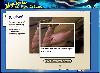 [Figure 8 Clue screen from Mysteries of Apo Island. www.sheddaquarium.org/SEA/interactive_module.cfm?id=9 We initially planned to develop a simulation for the high school audience (grades 9-10). But due to conceptual issues (detailed below) and budgetary constraints, we turned instead to an interactive reference module. In Conservation Investigation: Seahorses (Figure 9), students can explore a conservation issue through primary and secondary sources and write a newspaper editorial based on their research. The students assume the role of investigative reporters and are offered a range of materials about seahorse conservation grouped according to how journalists might research the story: field observations, interviews, and library materials. In writing the final product, the students are guided by a template that encourages logical organization and solid evidence to supporttheir opinion. This combines role-play and creative production elements, but in a less fanciful, more serious fashion for this more mature age group.