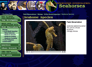 Figure 9. Seahorse video clip from Conservation Investigation: Seahorses. www.sheddaquarium.org/SEA/interactive_module.cfm?id=11 Integrating Learning Styles into One ActivityOne of the challenges of using Kolb's framework is that while it is clear how to match a particular learning style with a particular activity type, Kolb offers less guidance in creating a single activity that can meet the needs of learners with multiple learning styles. Howard Gardner's theory of multiple intelligences has earned wide acclaim and regard from both formal and informal educators. By examining many cognitive modalities, his theory inspires us to stretch the Web's capabilities to engage many different kinds of learners. Table 2 shows how Gardner's Entry Point Approach outlines ways to provide multiple entry points to a single learning experience "to accommodate the different lenses through which learners see" (Davis and Gardner, 1993).