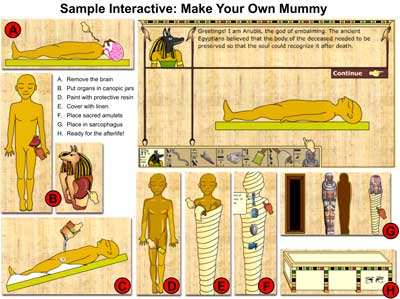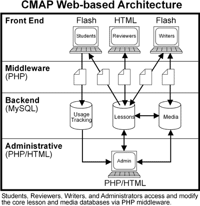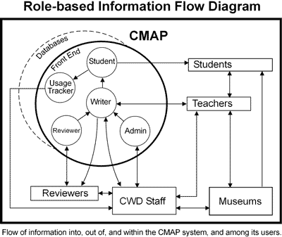 The result was that teachers felt disconnected from the process, and CWD staff spent too much time on mundane production processes and less and less time on our core missions: supporting teachers, building teacher and museum relationships, weaving content from multiple museums and libraries into the curriculum, and creating rich, imaginative and engaging educational experiences for Chicago Public Schools students. SolutionIn order to re-tool our production process, we needed to empower and engage teachers by giving them better access to digitized museum and library collections, and show them the results of their work immediately. We needed to streamline lesson writing and production and optimize media management in order to liberate CWD staff to focus on core missions. The solution was to build a database-driven system with an easy-to-use front end for both teachers and administrators, one which would also deliver the finished lessons to students in the Chicago Public Schools. We applied the imaginative moniker of "Content Management and Presentation System, and the CMAP project was born. One year later CMAP is a reality, and we have made great progress towards our goals. CMAP OverviewCMAP consists of two content databases and one usage-tracking database (MySQL). Of the former, the first is the media database which accommodates images, sounds, video, and interactives, as well as the associated metadata. The second is the lesson database which keeps track of all lesson elements such as page text, dictionary terms, journal questions, and customized media captions. The third database tracks student usage of lessons, including what museum objects were accessed during a lesson. The system has four role-based interfaces: Writer, Reviewer, Administrator, and Student. There are Flash-based graphical interfaces for Students and Writers, while the Administrator and Reviewer Interfaces are HTML (Hypertext Markup Language). All interfaces communicate with the databases via PHP middleware. (PHP is a recursive acronym for "PHP: Hypertext Preprocessor, a widely-used Open Source general-purpose scripting language that is especially suited for Web development and can be embedded into HTML. See figure 2.) Figure 2: Students, reviewers, writers, and administrators access and modify the core lesson and media databases via PHP middleware CMAP's relational database architecture allows CWD staff, teacher-writers, students, and expert reviewers to view, enter, and edit content in the ways that best suit their particular roles. Figure 3 CMAP creates efficiencies of labor by minimizing redundancy in the production process and allowing reuse of lesson materials. It empowers teachers by providing them with sophisticated yet intuitive tools for developing their lessons and with direct access to digitized content from multiple cultural institutions. Most important, it helps us achieve our goal of delivering engaging, on-line curriculum materials featuring the collections of Chicago's outstanding museums and libraries. The Student InterfaceIn 2001, we began development of a Flash-based template to present the lessons. Over the next two years the template was improved as it underwent multiple field tests in the schools. The resulting interface design combines the elements of a storybook with interactive features Figure 4: The Chicago WebDocent Lesson Interface featuring many interactive components The latest version of the Student Interface includes new and updated features and makes the leap from static text files to dynamic database-driven content in CMAP. The student using CWD chooses an assigned lesson within a curriculum module and is greeted by the docent character, who introduces the lesson topic. A lesson may include up to 10 chapters, or sections. Within each section there are 1 to 5 pages of text. The docent appears on every page of the lesson and can be animated to prompt students to explore the interactive features on the page or to provide feedback. Students can move between pages using a forward- or back-arrow button. They can also navigate through the lesson by clicking on page numbers listed in the sections. Media InteractionLesson pages include digitized images of primary source materials from our institutional partners. This content is presented as a clickable museum icon that opens full screen to reveal a high resolution image. We have incorporated a Zoomify viewer into our template so that students may zoom within this window to closely inspect and navigate images and texts (http://www.zoomify.com). Each image window includes a caption, source information, and perhaps bookmarks to specify areas of an image and text identified by the teacher for special attention. The image window can also include video. Journal InteractionLessons include an on-line journal. The journal appears "grayed out until students activate a page where a journal question appears; then the journal pops open to signal the presence of a question. Students answer the on-line journal questions and print responses at the end of the lesson or class period. The journal can include images, audio, and video in addition to text that presents open-ended questions, quizzes, and numeric or math word problems. Dictionary InteractionDefinition terms are listed on the page in the Words to Know box. The complete listing of vocabulary words for an entire lesson is accessible on every page. When a vocabulary word appears in a lesson for the first time, it is underlined and clickable. Clicking on an underlined word or one listed in the Words to Know box activates a window containing the definition and pronunciation, using standard dictionary symbols. The definition window can include images, audio, and video. Interactive Media ElementsSome lessons include interactive media elements, which are key enrichment activities that use the context of the story to integrate interdisciplinary skills and knowledge standards. Interactives present a simulation 