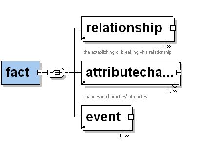 Fig 3. The Fact element DirectiveIncludes a number of optional secondary indications about location, lights, costumes etc. which, if used, can be useful to represent and visualize the narration more accurately The Schema has been conceived so to maintain as much generality and extensibility as possible. The segment concept for example, which reflects the same concept in MPEG7, being hierarchical, can easily be used to represent chapters, scenes, libretto lines, sequences, any structural decomposition should be regarded as functional to a specific representation. Therefore the concepts associated to it, such as pattern, can be referred to any level of narration, from the whole narrative to the single sequence, and can coexist at different levels. Inside any of these levels, the role attribute can be specified by a segment within that level or by a character or event. In this way, for example, the nine act structure pattern can refer to the whole narration while its acts or scenes would reference roles within it. Similarly and without contradicting the above, a single scene can be attributed the pursuit pattern and the fugitive and punishment roles attributed to different characters, or groups of them. The pattern concept itself has been defined but no attempt to restrict the nature or number of possible patterns has been attempted. It has been left to the users to define which and how many patterns to use. They can choose to rely on free imagination to describe the situations or, possibly, choose to adopt a library of predefined patterns provided by some authority and/or based on some particular theory. VisualizersXNDL does not define in itself a means of visualizing information, which is therefore left to special visualization programs to understand the language and deliver it to the viewers. Visualizers can be thought of as very simple or sophisticated and based on many different graphical devices. There are virtually no restrictions to what metaphor a visualizer can use to represent the underlying information contained in an XNDL file. A visualizer can choose to ignore certain information and many will want to provide discovery and cross searching tools, in order to identify similarities between different XNDL files, or order and classify them based on the dramatic patterns they use. We implemented two simple visualizers, a text based one, which basically transforms the information contained in an XNDL file into textual descriptions, as they occur during the narration; and a vector graphics (SVG) based prototype, which uses color, shape and arrows to give metaphorical descriptions of characters, roles, mood, actions and events.