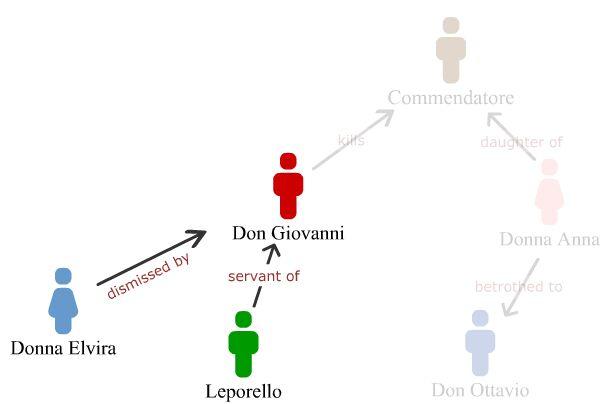 Fig 4. An SVG visualizer for XNDL One possibility we would like to explore is to produce a visualizer capable of rendering XNDL through UML collaboration diagrams, modeling characters as objects with the addition of a few dedicated stereotypes. Collaboration diagrams are, in fact, well suited for showing the relationships (thanks to the links) between objects and for dynamic animation aimed at continuously representing the evolving status of a system. Possible UsesAn authoring toolWith the XML schema in place, how the information is built up becomes critical. Authoring unaided would be an unwelcome task for most people whose work centers on the narrative. To ameliorate this situation an authoring tool will need to be created to enable people to build the structured information in a natural way. Such an authoring tool would have both a text input aspect and a graphical vector display of the plot visualization as it is built up. Expert interpretationsHow a narrative develops is part of the interaction between the author, the text/drama/opera/film and the listener/reader/viewer. However, experts in particular fields have ways they characterize such things, so they are the natural users of our extensible schema. By capturing their views in the schema, they can be made available to others, who can access the resultant XML. Given an appropriate authoring tool, such experts will be able to draw out the parallels and differences between different narratives, providing the grounds for comparative study. With an agreed standard, dramatic structures can be shared around the world, giving the possibility of comparing the way Mongolian shamans tell stories and the way Homer told his. Learners' interpretationsAs a student of drama we may come across many different approaches by experts to any particular plot; comparing them can often be difficult. Being able to see the plots as visualizations can immensely ease this process, enabling the development of a critical understanding. But further to this is the possibility that the learners themselves can create their own interpretation, visualize them and help themselves develop new and clearer understandings of dramatic structures. Building a community of learnersAs experts and learners develop their own interpretations of narrative structure, some interesting new possibilities arise. Given a standard XML Schema, this material can be shared. This means that, for example, students working in a school in England can develop a shared environment for the study of drama with students at a school in New Zealand. This network capacity opens up possibilities for diasporas everywhere. The traditional narratives of Nigeria can be studied by the Nigerian diaspora in the U.S. and their dramatic structures understood. This helps to build communities of understanding centered upon narrative architectures. The nuances of understanding, so often lost on distant observers/readers, can be elaborated by culturally embedded learners. By subtle semantic tagging, new emotional understanding can be revealed, providing a stronger basis for the creation of mutual understanding and significance. With a shared schema in place, as time moves on, it will become possible to literally see the way in which understanding of certain dramas has changed over the years. We would find it very enlightening now to be able to really comprehend how the members of the audience of the first night of Shakespeare's Romeo and Juliet understood the drama and compare it with the way the first night audience of West Side Story would have characterized its narrative development. Analysis Of Other Narrative FormsSpeechesThe use of the schema is not limited to what we think of as dramatic narratives, although this includes a vast range of cultural objects from epic poetry, plays, and operas to novels, musicals and films. We can also see how this schema can be applied to other narrative or dramatic objects. We can understand a speech as a dramatic object; the ancient art of rhetoric is based upon this premise. For instance, if we look at the way Plato unpacks the moral qualities of a speech in the Phaedrus we can see how significant this is. If we apply this approach to the speeches of modern politicians, we can picture the journey they are taking us on as listeners. ConversationsConversations can be mapped in similar ways, whether they are face to face, on the telephone or on-line. To be able to visualize conversations as dramatic structures is revealing. It enables us to understand the ebb and flow of ideas. This could be especially important where the conversation in question has special significance, in a court of law, for instance. JourneysJourneys can also be seen as a special sort of narrative. We only have to think of the narratives based upon the journey as a motif, from the Odyssey through to Chaucer and Dante, to contemporary road movies. Journeys have their own narrative structure, felt by the protagonist and observable through the filters of time and distance. Journeys can be mapped as dramatic structures, and the visualization of these can be linked to the geographic map of the journey. A quick overview of a narrativeAs well as the more intense uses outlined above, there are other situations where we want a quick, easy-to-understand overview. We might be rushing to get to the opera, not knowing what the basic plot is, wanting to just quickly scan the key elements on a mobile phone, or we might be needing a clear overview of a book we had hoped to have read. Or we might have missed the first part of a drama on television and want to catch up with what has happened and learn how the character relationships have developed. In these circumstances a visualization of the plot and the characters trajectories would enable us to grasp the essentials quickly and easily. This is especially true for those of us who think configurationally rather than in sequences. Authoring of dramatic structuresWhilst the 
