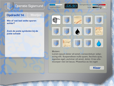 The Operation Sigismund development panel has given us feedback on mood boards, narrative scenarios, (interaction) design sketches, exemplary assignments, and hard- and software mock-ups. They even had to pretend walking through the basement rooms following chalked outlines of the interior elements. Their feedback and enthusiasm is an important factor in our development process, called ‘users-as-designers’.