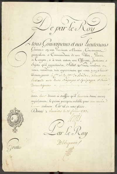 Fig 3 : Record from Sigismund’s personal archive: travel permit signed by the French king Louis XVI allowing Sigismund to travel freely through France to fulfill his diplomatic duties.