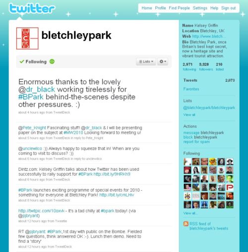 Fig 9: Bletchley Park Twitter page, 31 January 2010 (http://twitter.com/bletchleypark).